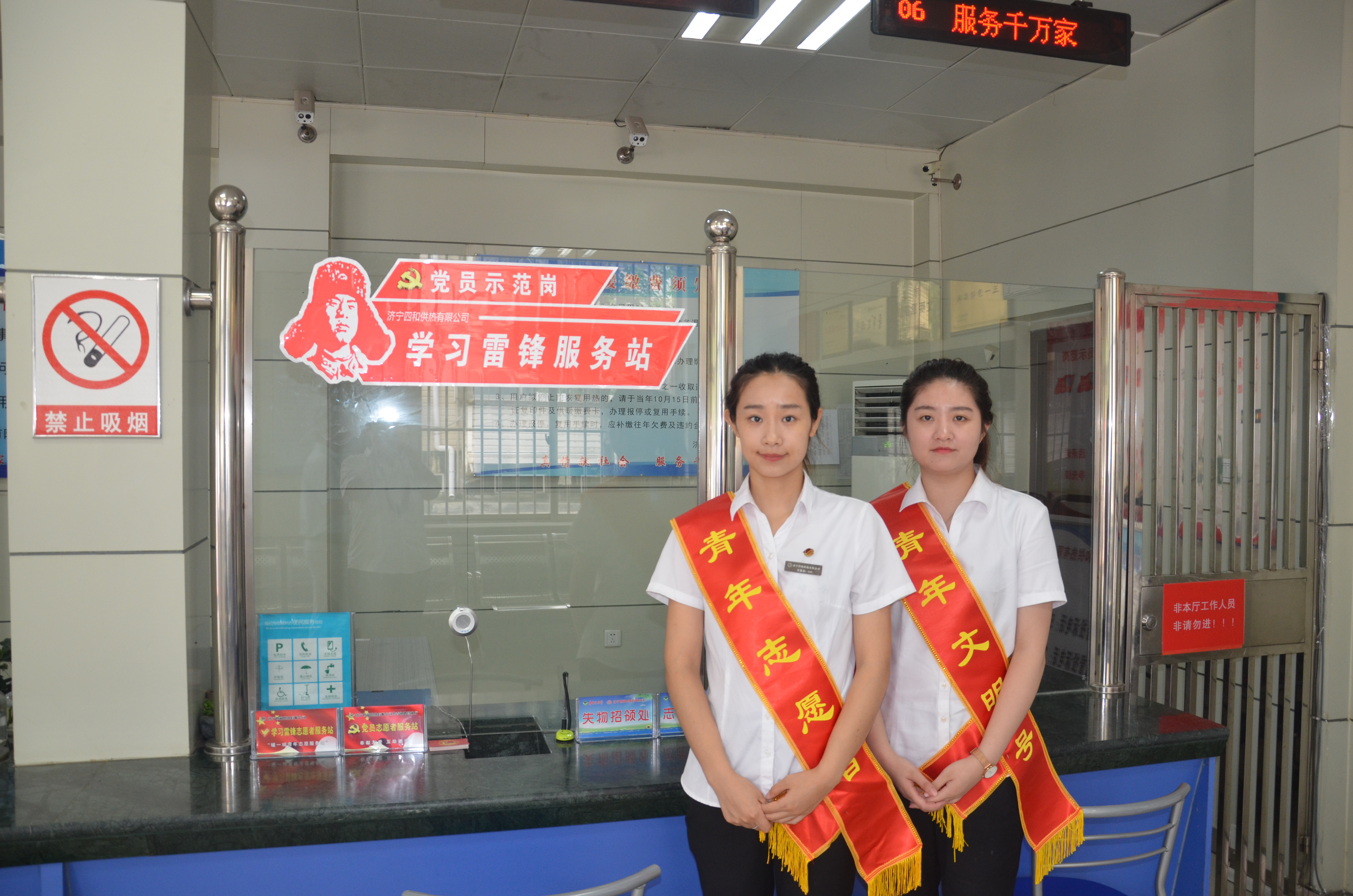 7月20日,濟寧市四和供熱共青團客服中心設立的“黨員示范崗學雷鋒志愿服務站”正式上崗服務。志愿站設在客服中心的醒目位置,志愿服務者佩帶“青年志愿者”服務標識,站立在服務引導臺實行微笑服務,前來辦事的群眾進門就能看到,方便咨詢。